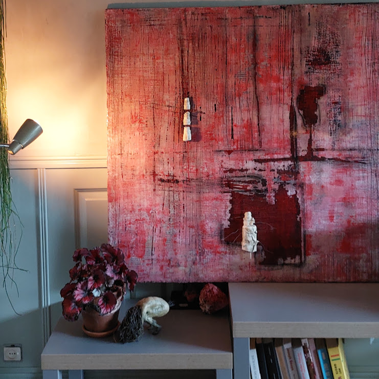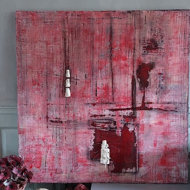 Behind the Backpack is een abstract schilderij dat diepte en structuur toevoegt aan elke ruimte. Dit kunstwerk, zorgvuldig gelamineerd met epoxy, combineert levendige roodtinten met subtiele details voor een dramatisch effect. De driedimensionele elementen brengen het schilderij tot leven, perfect voor wie houdt van moderne kunst met een rauw randje.